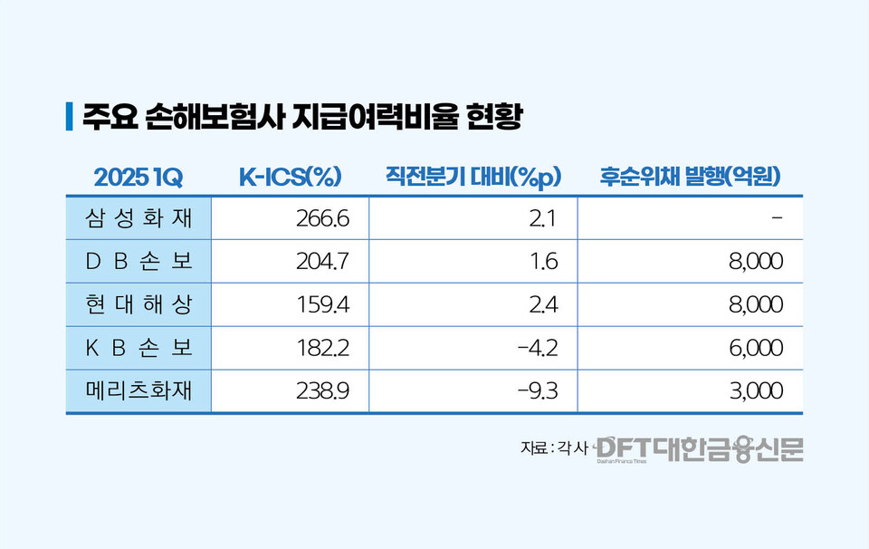 이 기간 현대해상과 DB손해보험은 각각 8000억원의 후순위채권을 발행하며 2.4%p, 1.6%p씩 개선됐다. 후순위채를 제외하면 킥스비율은 하락으로 돌아선다. KB손해보험과 메리츠화재는 후순위채를 발행했음에도 킥스비율이 4.2%p, 9.3%p씩 하락했다.