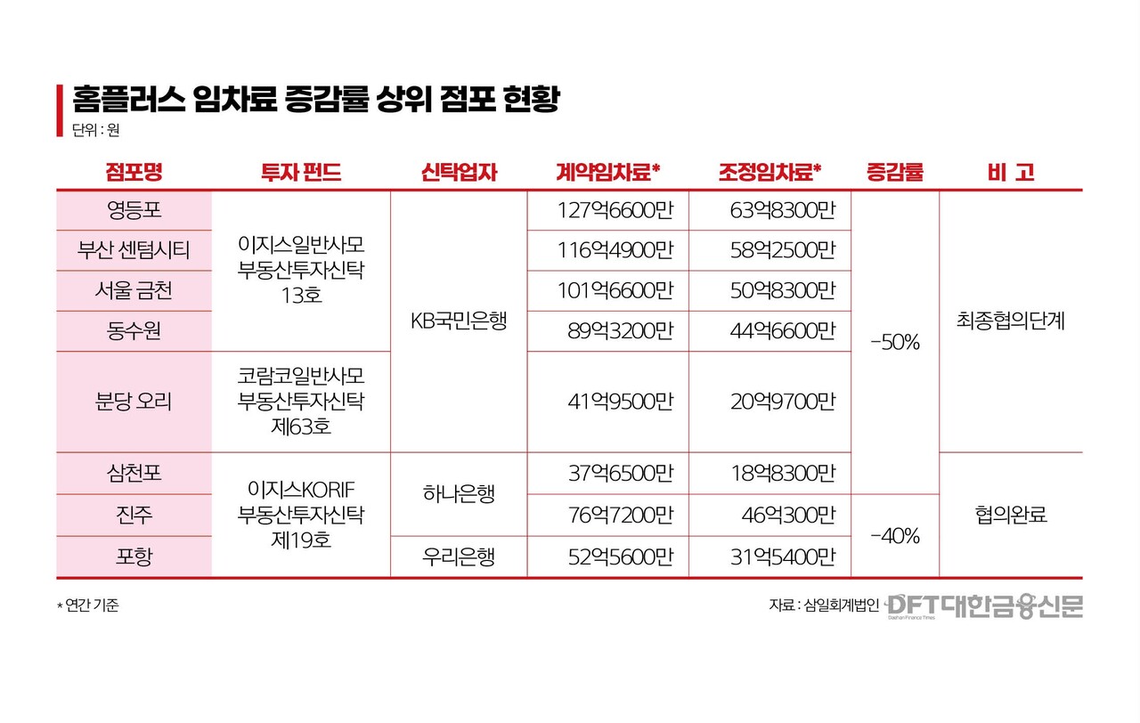 삼천포점의 임차료는 연 37억6500만원에서 18억8300만원으로 50% 감소한다. 진주점 임차료는 연 76억7200만원에서 46억300만원, 포항점은 연 52억5600만원에서 31억5400만원으로 각각 40% 감소한다. 삼천포·진주점의 신탁업자는 하나은행, 포항점의 신탁업자는 우리은행이다.