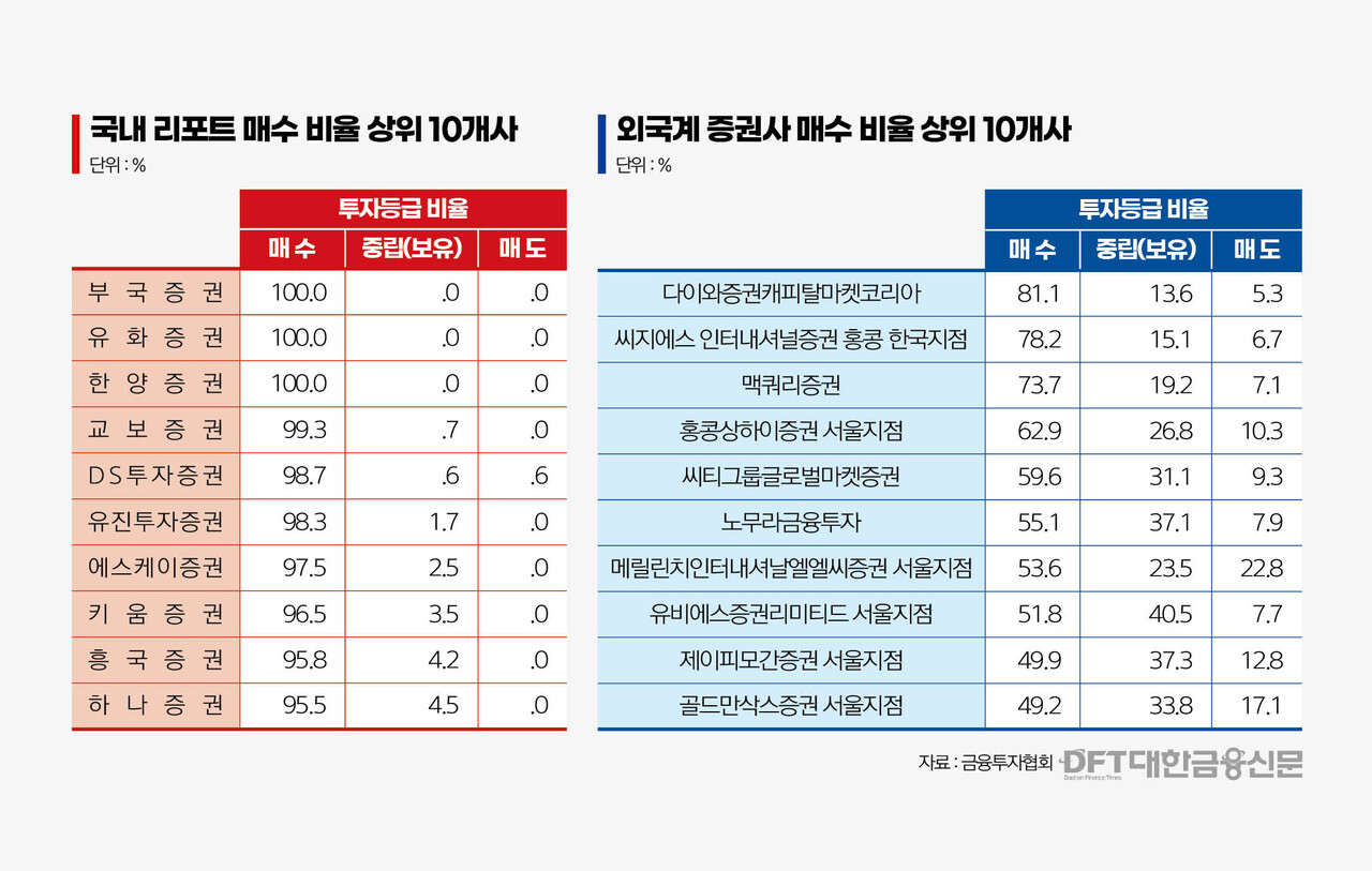 이중 한양증권은 중립과 매도 없이 ‘100% 매수’ 의견을 내기도 했으며, 교보증권 매수 비율도 99.3%로 높은 수준을 기록했다.