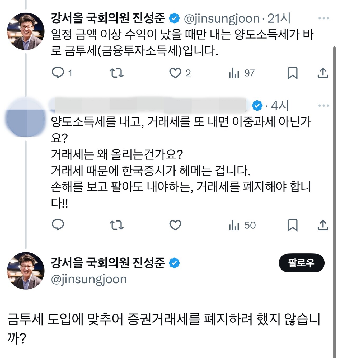 해당 글이 올라온 지 2시간이 흐른 5일 새벽 1시 25분 진 의원은 “일정 금액 이상 수익이 났을 때만 내는 양도소득세가 바로 금융투자소득세(금투세)입니다”라는 댓글을 달았습니다. 과거 자신이 추진하던 금투세 시행과 해외의 양도소득세 체계가 다르지 않다고 주장한 것입니다.