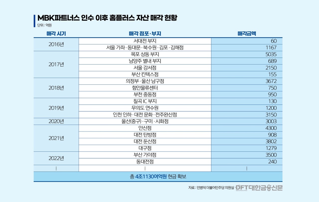 국회 정무위 소속 민병덕 더불어민주당 의원실에 따르면 홈플러스는 투자금 상환을 위해 점포·부지를 매각하거나 세일즈앤리스백(매각 후 임차) 방식으로 처분해 4조1130여억원을 현금화했다.