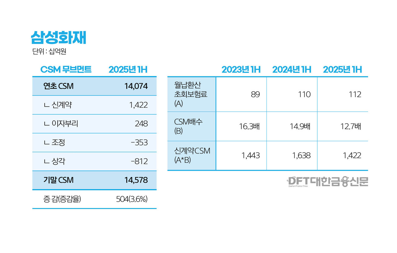 반기 상각액이 8000억원을 넘는 보험사는 삼성화재가 유일하다. 연간으로 따지면 1조6000억원 규모다. 신계약CSM이 꾸준히 우상향하지 않는 한 소진 속도가 증가 속도보다 빨라질 수 있다.