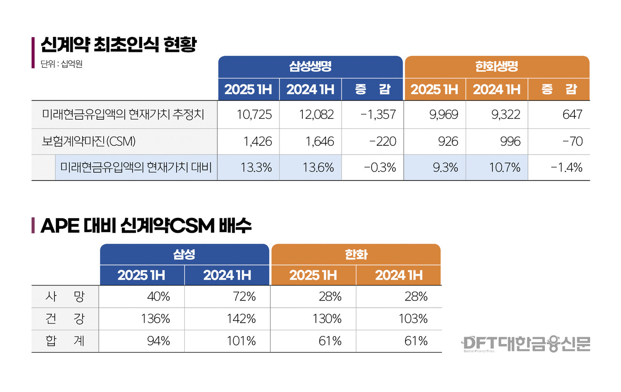 수익성 지표인 APE배수(CSM/APE)로 살펴보면 올 상반기 삼성생명의 사망보험 APE배수는 40%, 한화생명은 28%다. 건강보험 배수는 각각 136%, 130%로 비슷한 수준이다.