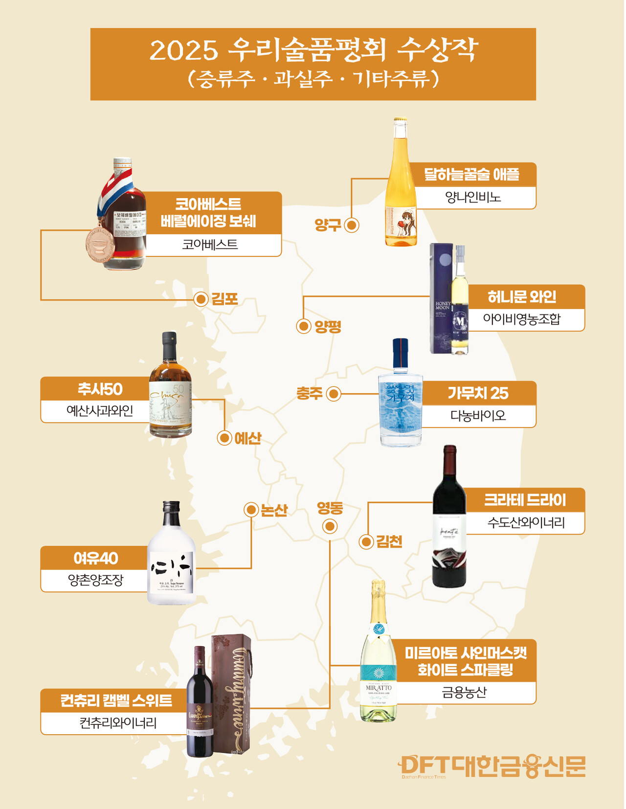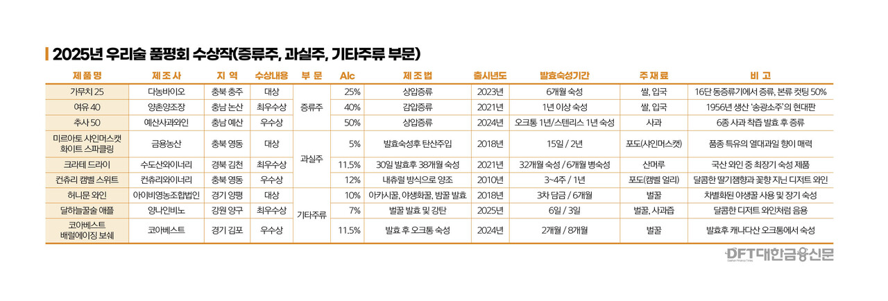 2025년 우리술품평회의 3개 부문 수상작의 특징을 살펴보면 예년과 다른 경향성이 발견된다. 새롭게 나타난 트렌드의 공통점을 종합해서 설명한다면 ‘주품(술맛)의 상향 평준화’라고 답할 수 있다. 세부적으로 내용을 살펴보자. 증류주와 과실주 부문 수상작은 장르가 고르게 분포된 특징이 있다. 그만큼 부문별 주품이 좋았다는 이야기가 된다. 기타 주류에서의 특징은 리큐르가 한 점도 선정되지 않고 모두 벌꿀술(미드)이 상을 휩쓸었다는 점이다. 그리고 상을 받은 벌꿀술마저도 다양한 스타일의 술이 상을 받았다.