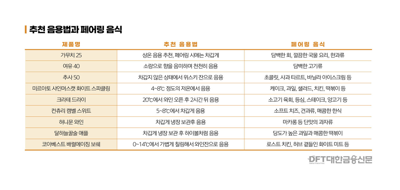 가무치 25는 상온에 두었다가 노징글라스에 따라 향미를 천천히 즐기며 음용하는 것이 좋다. 상온으로 마실 때 향을 제대로 느낄 수 있기 때문이다. 음식과 함께 반주로 마신다면 차갑게 냉장 보관한 술을 보통의 잔으로 마시는 것도 괜찮다. 같이 즐길 수 있는 안주는 담백한 회와 깔끔한 국물 요리, 그리고 한과류와도 같이 마실 수 있다고 한 대표는 말한다.
