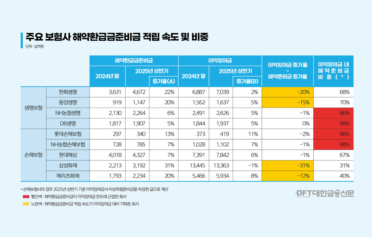 한화손해보험(81.6%)도 해약환급금준비금 적립 속도에 따라 위험수위로 평가된다. 현대해상(66.7%), KB손해보험(63.4%), 라이나손해보험(61.7%) 등도 비중이 절반을 넘어섰다.