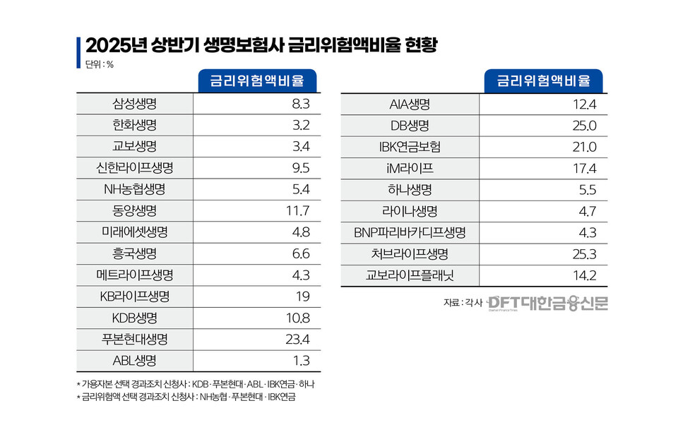 3일 대한금융신문이 올 상반기 기준 국내 생보 22개사와 손보 16개사의 금리위험액비율(금리위험액÷지급여력금액)을 종합했다.