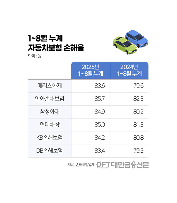 자동차보험 시장점유율 85% 이상을 차지하는 상위 4개사의 올 8월 자동차보험 손해율은 삼성화재 88.1%, 현대해상 87.5% DB손해보험 84.6%, KB손해보험 86.5%를 기록했다.