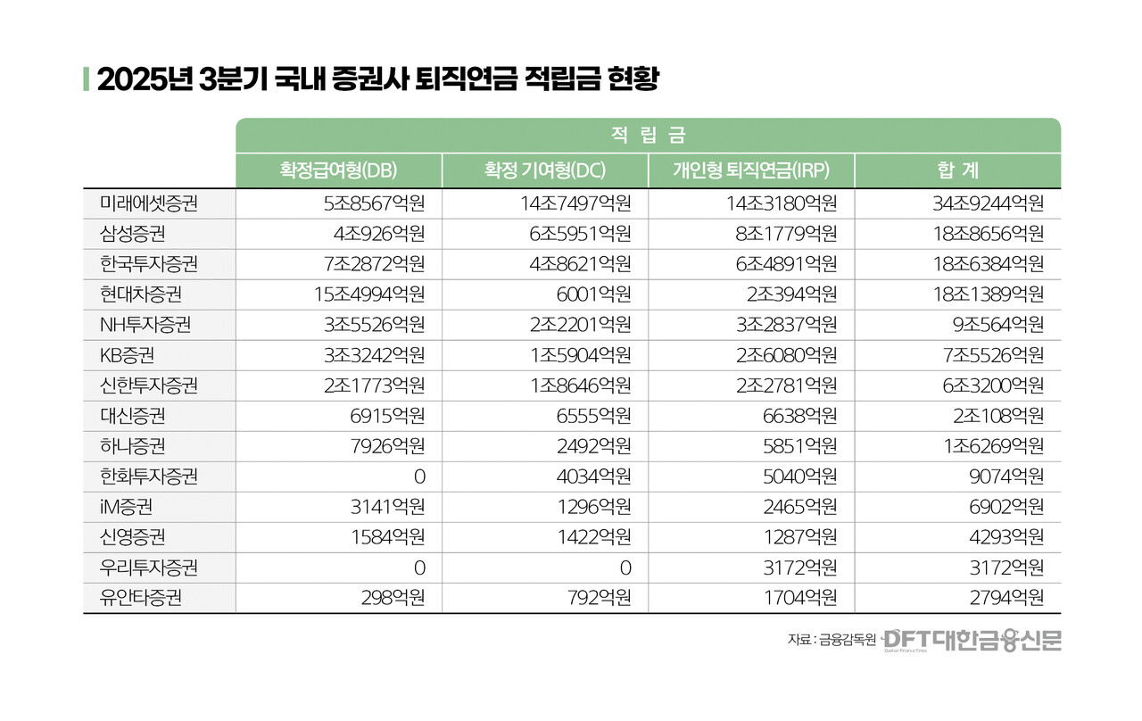 올해 3분기 말 기준 국내 증권사 퇴직연금 적립금 1위는 미래에셋증권이다. 총 34조9244억원으로 전 분기 대비 2조7410억원(8.5%) 증가했다.
