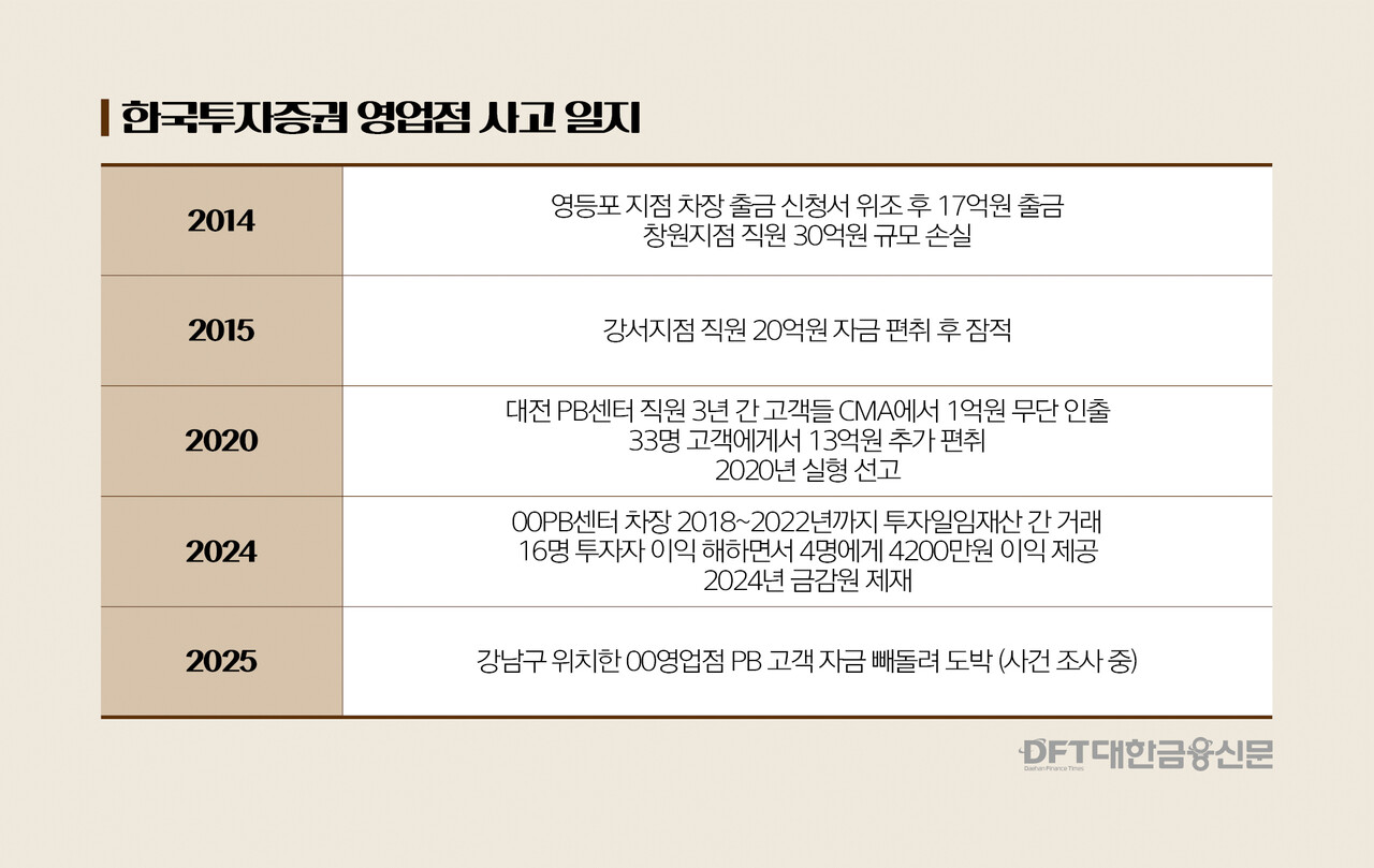잇따른 고객자금 유용 사고로 한국투자증권의 신뢰가 흔들리고 있다. 지난 10년간 꾸준하고 반복적으로 이어져 온 PB들의 일탈은 내부통제 체계가 정상 작동하지 않는다는 비판의 배경이 된다.