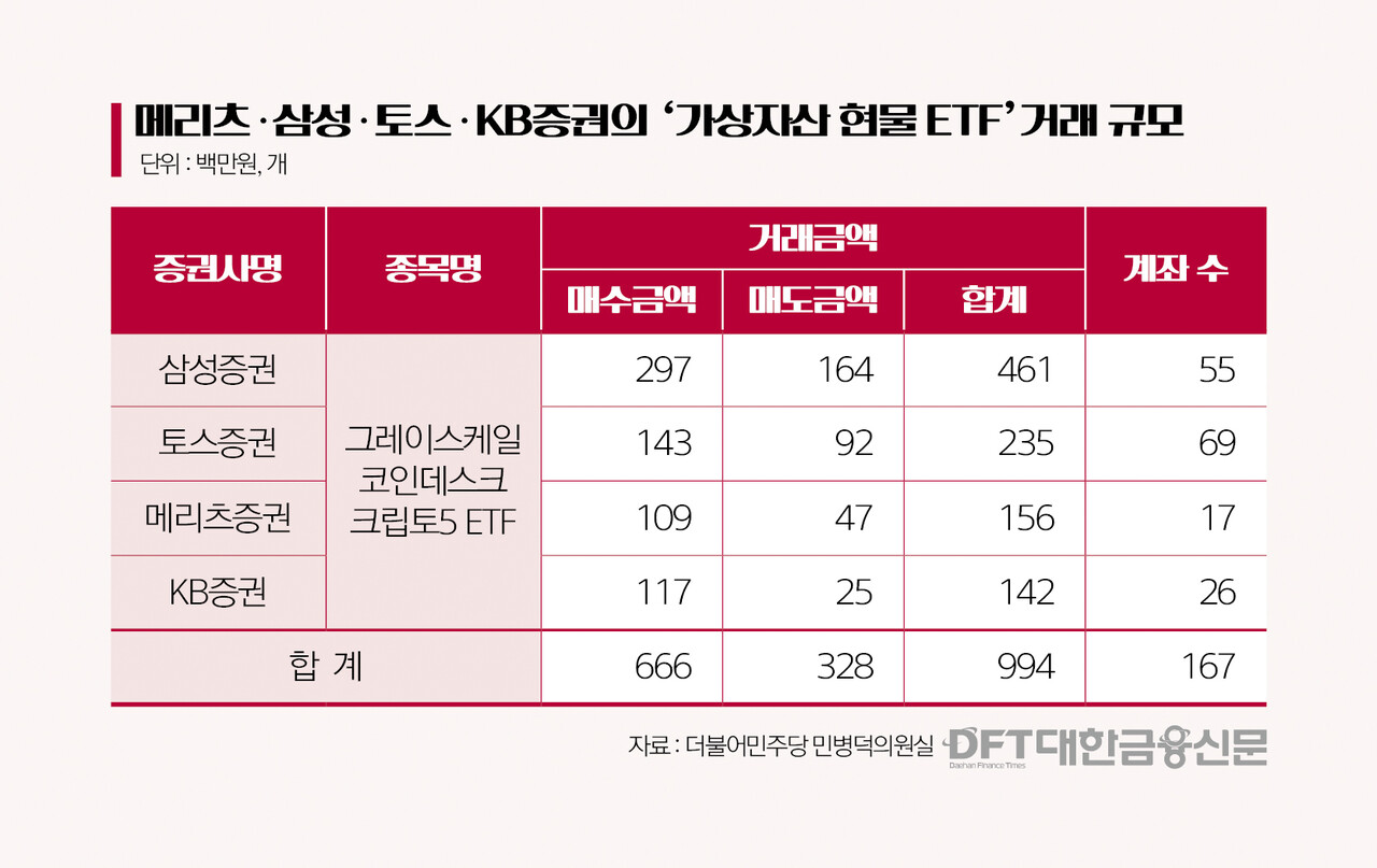25일 본지가 민병덕 더불어민주당 의원실로부터 입수한 자료에 따르면, 메리츠·삼성·토스·KB 등 4개 증권사에서 거래된 해외 가상자산 현물 ETF 거래 규모는 총 6억6600만원으로 집계됐다.